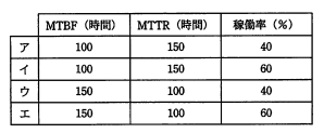 あるシステムは5,000時間の運用において,故障回数は20回,合計故障時間は2,000時間であった。おおよそのMTBF,MTTR,稼働率の組合せのうち,適切なものはどれか。