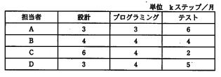 プログラムの開発作業で担当者A〜Dの4人の工程ごとの生産性が表のとおりのとき,4人同時に見積りステップ数が12kステップのプログラム開発を開始した場合に,最初に開発を完了するのはだれか。