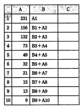 セルA1〜A10に表のような数値が入力されており,セルB1〜B10に計算式が入力されている。このときのセルB1〜B10の計算結果とセル C1〜C10の計算結果がそれぞれ同じ数値となるようにするために,最初にセルC10に計算式を入力し,次にセルC10をセルC1〜C9に複写したい。セルC10に入力する計算式として,正しいものはどれか。