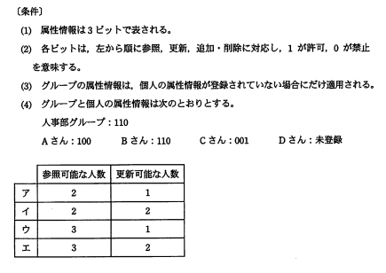 所属するグループ及び個人の属性情報によって,人事ファイルへのアクセスをコントロールするシステムがある。人事部グループの属性情報と,そこに所属する4人の個人の属性情報が次の条件の場合,人事ファイルを参照又は更新可能な人数の組合せはどれか。
