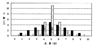 横軸を点数(0〜10点)とし,縦軸を人数とする度数分布のグラフが,次の黒い棒グラフになった場合と,グレーの棒グラフになった場合を考える。二つの棒グラフを比較して言えることはどれか。