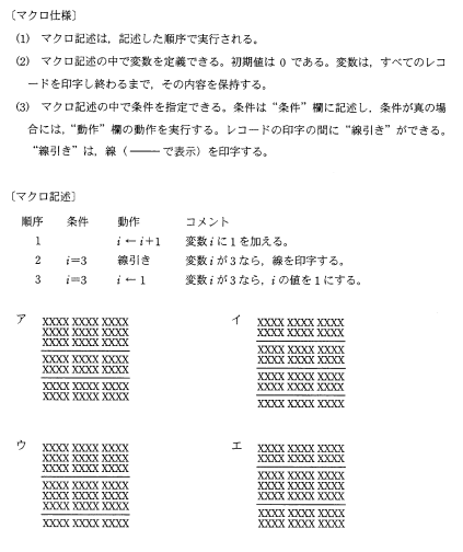ファイル中のレコードを1レコードずつ印字するソフトウェアがある。このソフトウェアは,レコードを印字する直前にマクロ記述を呼び出して実行する。次の マクロ記述を使って印字したものはどれか。ここで,ファイルの1レコードは1行(XXXX XXXX XXXX で表示)に印刷される。