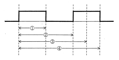 パソコンのカタログに“CPUクロック周波数1GHz”とあった。これは1秒間に10億周期の信号でCPUが動作していることを表している。この1周期は,次の矩形波のどの部分を指すか。