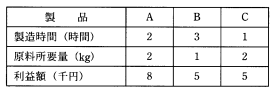 工場Xでは,ある原料から3種類の製品A,B及びCを生産している。各製品の単位量当たりの製造時間と原料所要量及び利益額は表に示すとおりである。この工場の月間合計製造時間は最大240時間であり,投入可能な原料は月間150kgである。このとき,製品A,B及びCをそれぞれどれだけ作ると最も高い利益が得られるかを知りたい。この問題を解くのに適切な手法はどれか。