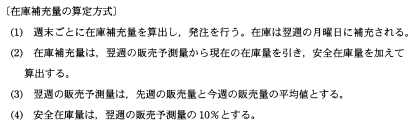 X社では,次の算定方式で,在庫補充量を決定している。第n週の週末時点での在庫量をB[n],第n週の販売量をC[n]としたとき,第n週の週末に発注する在庫補充量の算出式はどれか。ここで,nは3以上とする。