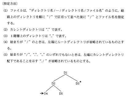 あるファイルシステムの一部が図のようなディレクトリ構造であるとき,*印のディレクトリ(カレントディレクトリ)D3から矢印が示すディレクトリD4の配下のファイルaを指定するものはどれか。ここで,ファイルの指定は,次の方法によるものとする。