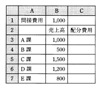 表計算ソフトを使って,発生した間接費用を,各課の売上高に応じてそれぞれに比例配分するとき,次の表のセルC3に入力すべき計算式はどれか。ここで,間 接費用はセルB1に,各課の売上高はセルB3〜B7に入力されており,セルC3の計算式はセルC4〜C7に複写されるものとする。
