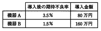 毎年1,000,000個の製品を生産している工場がある。不良率は5%であり,不良品1個当たりの損失額は10円である。不良率を低減させ,製品1個当たりのコストを削減させるために,表に示す機器A,Bの導入を検討している。生産量,不良品1個当たりの損失額は変わらず,機器はそれぞれ5年間使用する。機器の導入によるコスト見積りに関する記述のうち,適切なものはどれか。