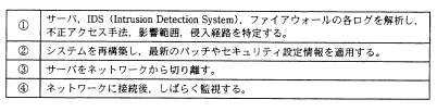 Webサーバが外部から侵入され,コンテンツが改ざんされた。その後の対応の順序のうち,適切なものはどれか。