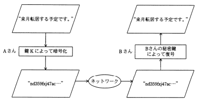 公開鍵暗号方式を用いて,図のようにAさんからBさんへ,他人に秘密にしておきたい文章を送るとき,暗号化に用いる鍵Kとして,適切なものはどれか。