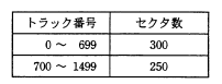 記録面が2面の磁気ディスク装置において,1面当たりのトラック数が1,500で,各トラックのセクタ数が表のとおりであるとき,この磁気ディスク装置の容量は約何Mバイトか。ここで,1セクタの長さは500バイト,1Mバイト=10^6バイトとする。