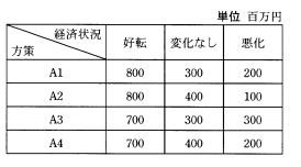 X社では,生産の方策をどのようにすべきかを考えている。想定した各経済状況下で各方策を実施した場合に得られる利益を見積もって,利益表にまとめた。経済状況の見通しの割合が好転30%,変化なし60%,悪化10%であると想定される場合,最も利益の期待できる方策はどれか。