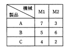 三つの製品A,B,Cを,2台の機械M1,M2で加工する。加工は,M1→M2の順で行わなければならない。各製品をそれぞれの機械で加工するのに要する時間は,表のとおりである。このとき,三つの製品をどの順序で加工すれば,加工を始めてから全製品の加工が終了するまでの時間が最も短くなるか。ここで,ある製品のM1での加工が終了したとき,別製品を続けてM1で加工することができるものとする。また,段取りなどの準備時間は無視する。