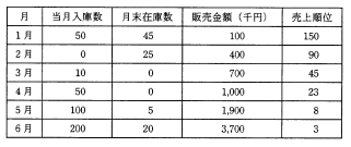 約200種の商品を扱う販売店における,ある商品の月別販売状況を表に示す。この商品は月末の在庫状況によって,翌月の上旬に在庫が補充されている。今 後,この商品の発注方法として,適切なものはどれか。ここで,売上順位は,全商品を販売金額で順位付けしたときの,この商品の順位である。