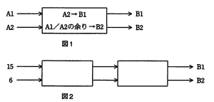 図1のように二つの正の数値A1,A2を読み取り,二つの数値B1,B2を出力するボックスがある。B1にはA2と同じ数値を出力し,B2にはA1をA2 で割った余りを出力する。図2のようにこのボックスを2個つないだ場合,A1=15,A2=6のとき後方のボックスのB1に出力される数値は幾らか。