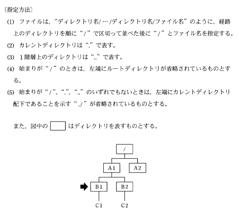 図の階層型ファイルシステムにおいて,カレントディレクトリが矢印で示すB1であるとき,ファイルC2を指定するものはどれか。ここで,ファイルの指定は,次の方法によるものとする。