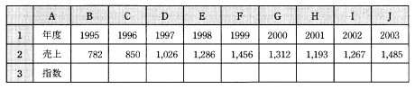 1995年度の売上額を100としたときの各年の売上指数を計算するために,セルB3に入れるべき式はどれか。ここで,セルB3の式は,セルC3〜J3に複写する。